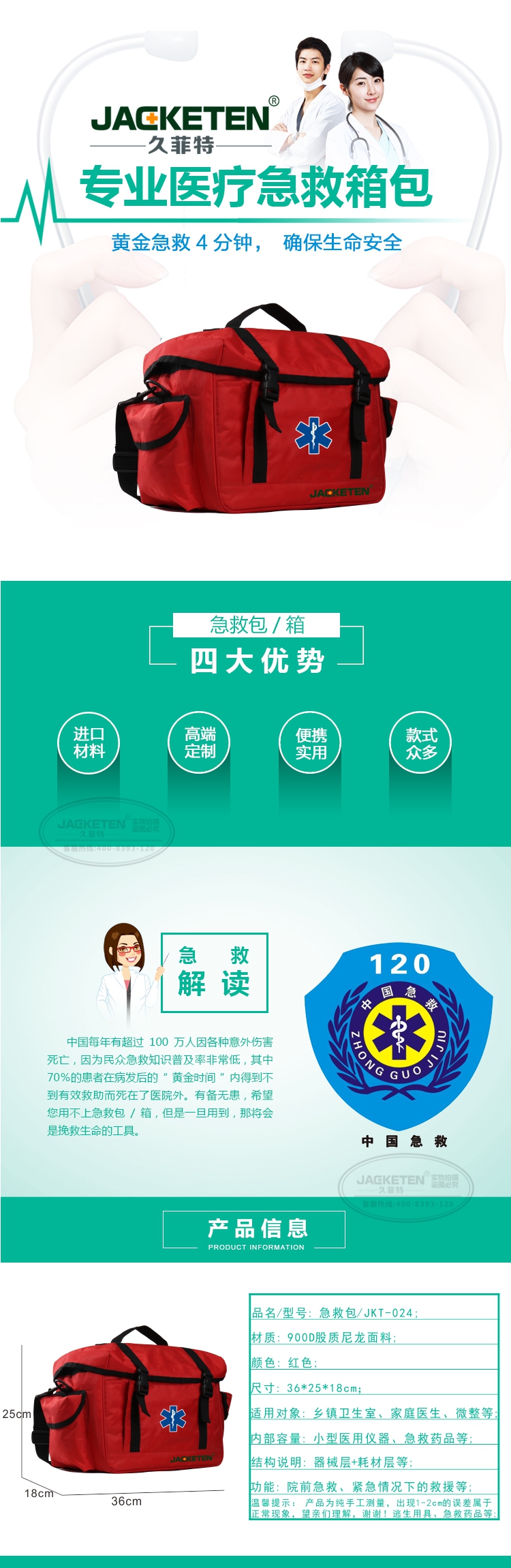 品名/貨號:急救包/JKT-024;材質(zhì):900D股質(zhì)尼龍面料;顏色:紅色;尺寸:36*25*18cm;適用對象:鄉(xiāng)鎮(zhèn)衛(wèi)生院、家庭醫(yī)生、微整等;內(nèi)部容量:小型醫(yī)用儀器、急救藥品等;結(jié)構(gòu)說明:器械層+耗材層;功能:院前急救、緊急情況下的救援等